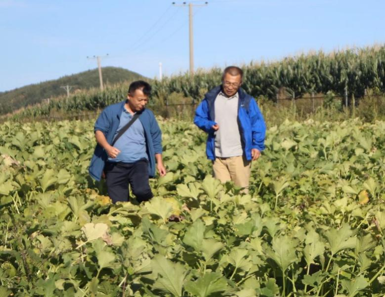 工作人员在南瓜试验田地调查