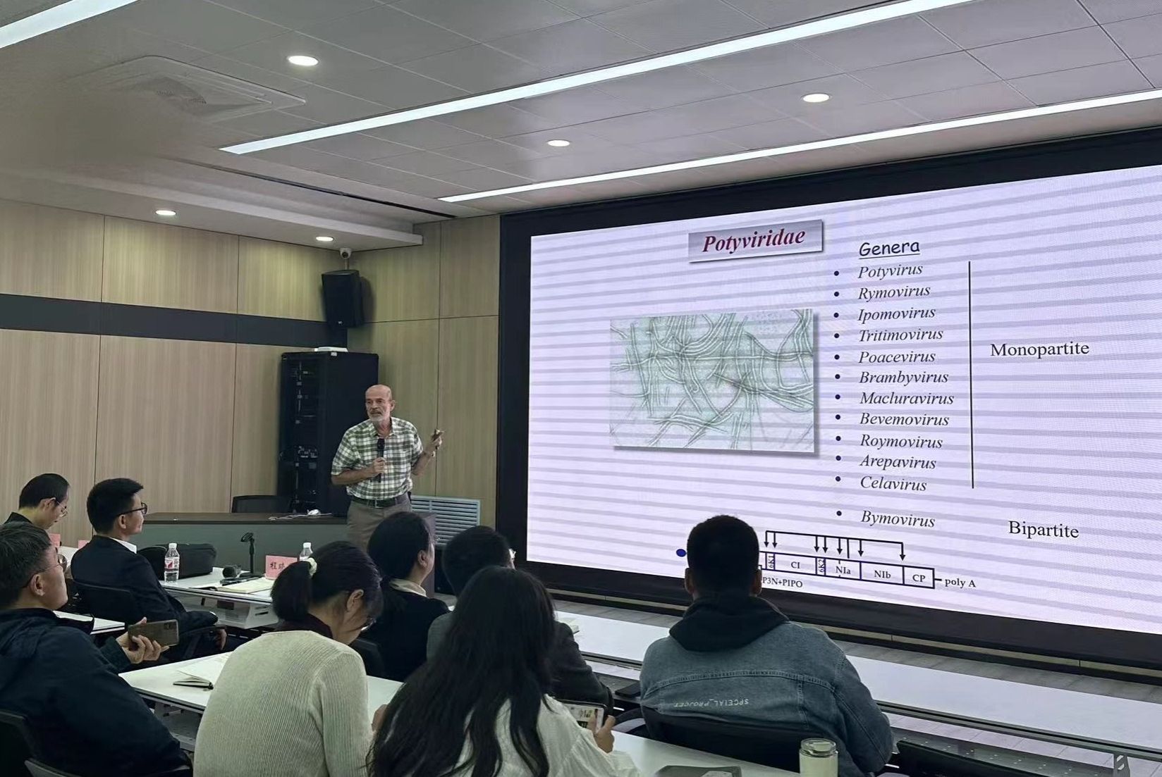 Juan Antonio García教授做题为《Relevance of HAM1 pyrophosphatases in euphorbiaceae-virus co-evolution》的学术报告。报告主要介绍了该团队以马铃薯Y病毒科(Potyviridae)的乌干达木薯褐色条纹病毒(Ugandan cassava brown streak virus, UCBSV)编码的HAM1焦磷酸酶在病毒适应木薯过程中的关键作用和诱导寄主细胞程序性死亡的功能。
