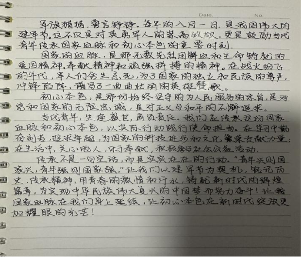 在这个骄阳似火的夏日,我们迎来了又一个庄严而神圣的“八一”建军节。在这个充满敬意与感激的日子里,u8国际平台精心策划并成功举办了以“赓续红色血脉,永葆初心本色”为主题的征文活动,旨在通过文字的力量,让每一位同学都能深刻感受到中国军人那份沉甸甸的责任与荣耀,让红色基因在新时代的青年心中生根发芽。
