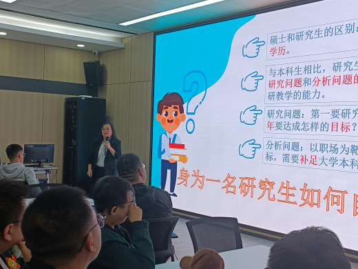 公司研究生秘书陈元从研究生学习相关的选课、学业、中期考核、毕业、票据报销等方面为员工介绍了研究生学习相关的各项事务基本情况,并预祝研究生新生学业顺利。