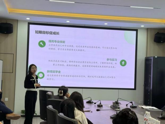 刘金鑫老师向同学们简单介绍了自己的求学历程以及心路变化。刘老师提出“要短期目标促成长”,提高专业技能是未来职业发展的基础,积极寻求实习机会、提高实践能力、积累工作经验。刘老师还表明“长期目标显雄心”,要确立好毕业去向,不断提升专业能力、保持良好心态、积累经验达到心理预期的目标。