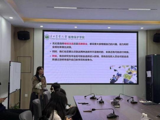 张傲楠老师向同学们表明,无论是继续深造还是直接就业,都要根据个人兴趣、能力以及职业规划做出决策。张老师还以自己的亲身经历建议同学们要勇于探索与尝试,可以主动与学长学姐交流、参加各种讲座和研讨会拓宽自己的视野;张老师还向同学们介绍了夏令营等的相关知识,同时强调了要明确自己的方向与规划。