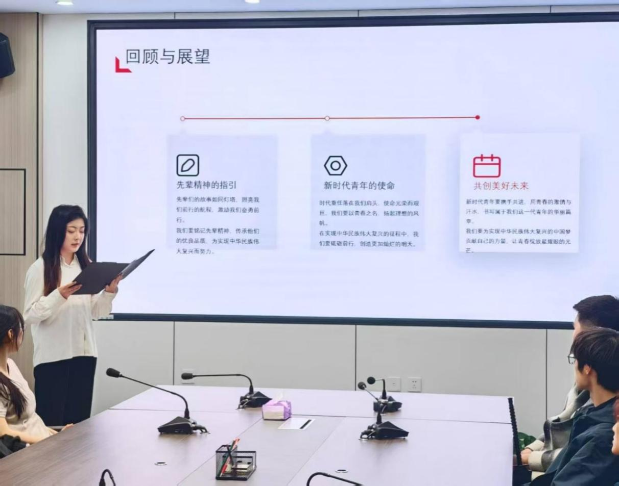 宣讲人徐佳怡同学以“先辈精神的指引”“新时代青年的使命”和“共创美好未来”三大篇章为主线,通过鲜活的历史故事、生动的当代案例和深情的青春宣言,带领全场同学穿越时空长河,在历史与现实的交汇中汲取奋进力量,使革命传统与青春力量在思想碰撞中焕发新生。以此强化了同学们对初心使命的认知认同,增强了同学们投身时代建设的责任感,凝聚起同学们接续奋斗的集体共识。