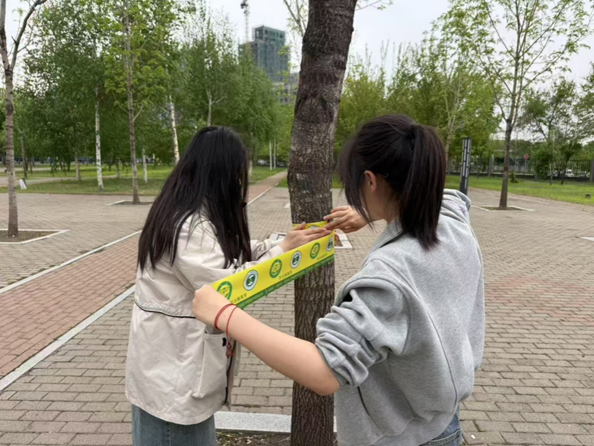 随着气温回暖,为应对树木害虫的威胁,传递“绿色防控”的理念。5月14日下午14:00,在田镇齐老师的讲解下,联合昆虫协会并在院内招募,为校内“50+棵树木”开展“胶带守卫绿荫”害虫物理防控行动,为校园树木筑起绿色屏障。