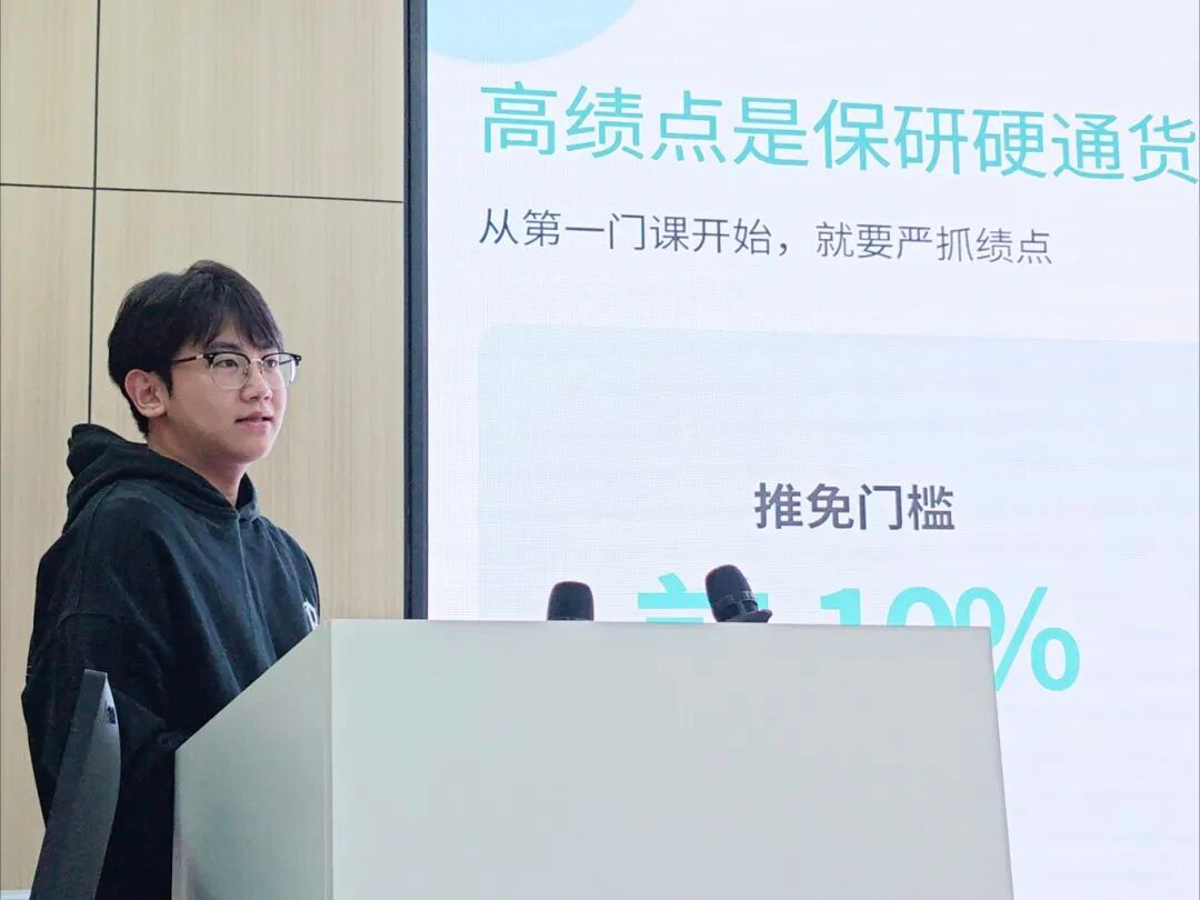 接着,赵旭同学围绕保研的关键——智育成绩,深入剖析保研决定因素和分值占比。宣讲中还介绍了各类保研信息渠道,并解答同学们对于保研问题的疑惑。他的经验分享让大家对保研的学习之路也有更为清晰的认识。