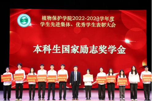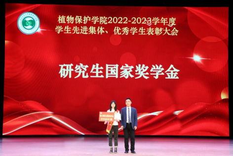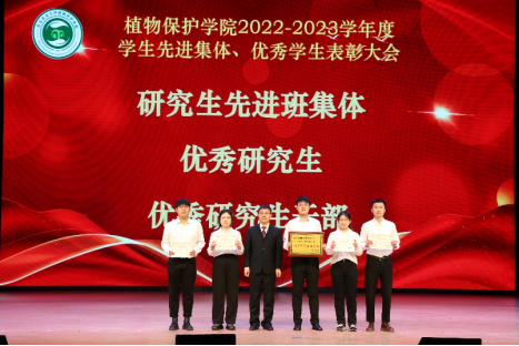 研究生获奖代表硕植保2101班刘岱霖上台发言。他谈到,我们作为新时代青年要有自主学习的意识;在学会学习的同时也要讲诚信;要培养奋斗精神,做到理想坚定,顽强拼搏。号召同学们躬耕田野,脚踏大地,为社会主义现代化、中国式现代化贡献植保人的智慧与力量!